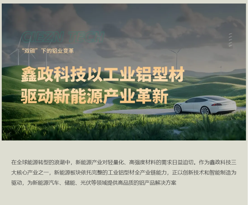 鑫政深耕工業(yè)鋁型材領(lǐng)域,全面布局新能源產(chǎn)業(yè),持續(xù)拓展產(chǎn)品矩陣。在汽車輕量化領(lǐng)域,創(chuàng)新研發(fā)電池托盤、端板、防撞梁、門檻梁等核心部件;在清潔能源領(lǐng)域,積極拓展儲(chǔ)能系統(tǒng)支架與光伏型材。通過特種合金黃金比例配方與精密壓延工藝的深度融合,鑫政正以材料創(chuàng)新和技術(shù)創(chuàng)新助力全球綠色產(chǎn)業(yè)升級(jí)。